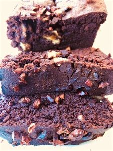 Ingredients: almond milk, eggs, monk fruit, almond flour, salted butter, pecans, dark chocolate, cacao powder, cacao butter, cacao nibs, apple cider vinegar, MCT oil, baking soda, baking powder, guar gum, pink salt.